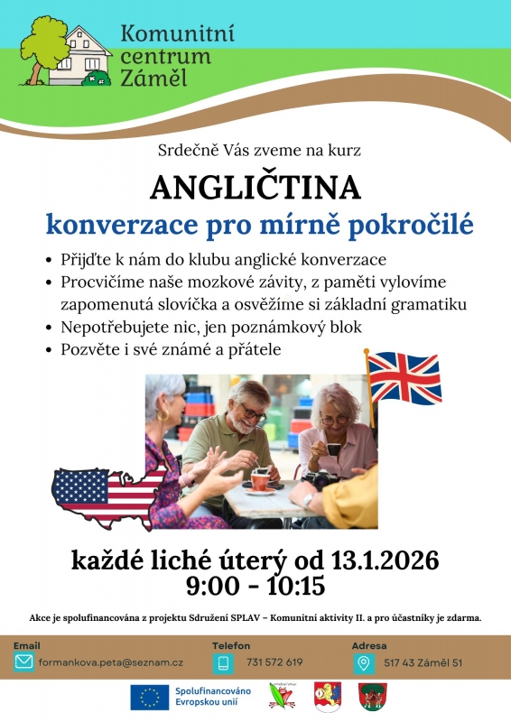 Přijďte i osvěžit a procvičit vaše znalosti angličtiny, lekcemi vás provede pan Fikejs. Začínáme v úterý 13.1.  v 9:00h. Scházet se budeme pravidelně, každé liché úterý.