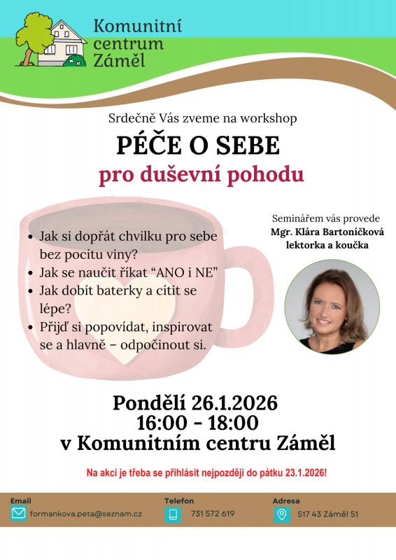 Přijďte si odpočinout a naučit se poslouchat potřeby vašeho těla i duše. Provede vás Klára Bartoníčková. Na akci je potřeba se přihlásit do pátku 23.1.