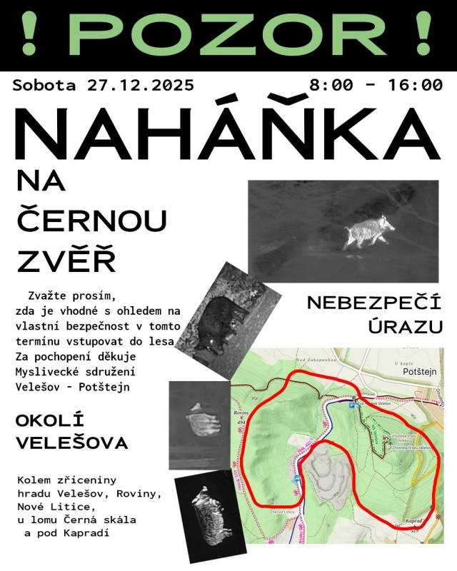 Upozorňujeme občany, že v sobotu 27.12.2025 od 8:00 do 16:00 proběhne kolem zříceniny hradu Velešov, u lomu Černá skála, pod Kapradí, v okolí Nových Litic a Roviny naháňka na černou zvěř (divočáci). Naháňka se zaměřuje na lov spárkaté zvěře, především černé zvěře, a bude probíhat za pomoci loveckých psů. Přestože lovečtí psi nejsou pro lidi nebezpeční, vstup do oblasti naháňky může být pro neinformované návštěvníky rizikový. Všichni účastníci lovu mají reflexní oblečení a jsou na situaci dobře připraveni, včetně speciální ochrany psů a honců. Bohužel však nemůže být zajištěna podobná ochrana pro náhodné návštěvníky lesa.