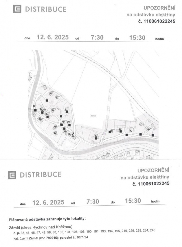 Plánovaná odstávka ČEZ 12.06.2025 7:30 - 15:30